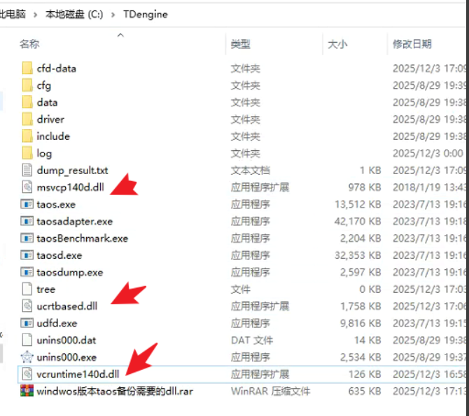 在windwos操作系统上TDengine-server-3.0.7.1-Windows-x64版本taos使用taosdump提示由于找不到MSVCP140D.d,无法继续执行代码。重新安装程序可能会解决此问题。其实不止是这一个dll,会有多个dll.我在windwos中执行后提示缺少:msvcp140d.dll、ucrtbased.dll、vcruntime140d.dll这三个文件丢失。解决