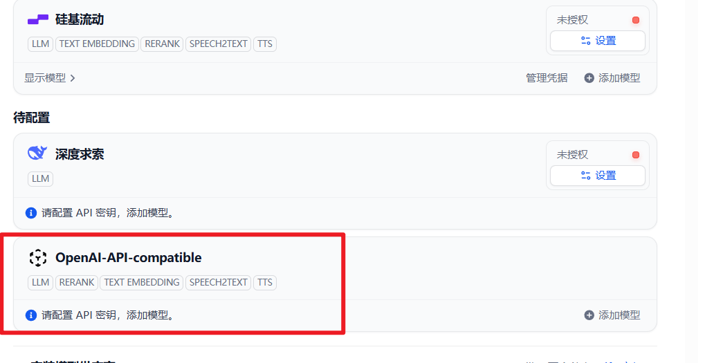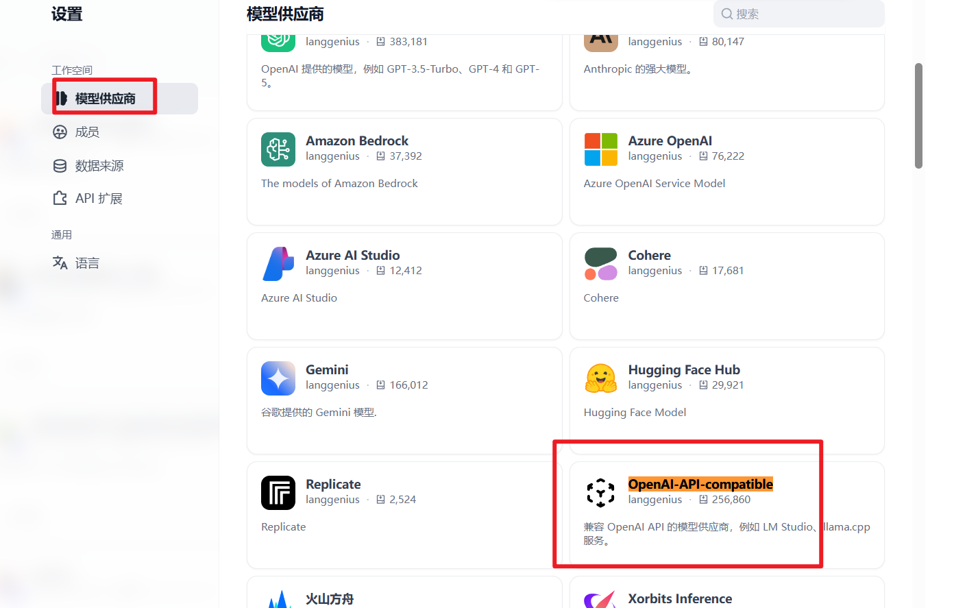 选择供应商:找到并点击 “OpenAI-API-compatible” 卡片上的“安装”或“配置”按钮。
