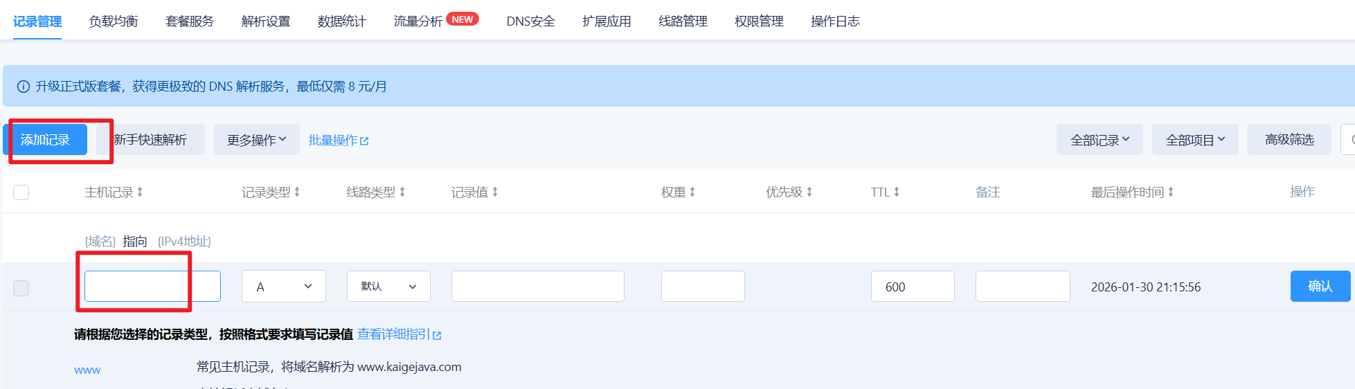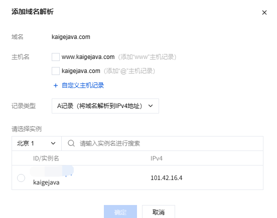 readmore,最终生成readmore.kaigejava.com)。记录值:直接输入阿里云服务器的公网IP(无需选择实例,这里可以手动输入任意IP地址)。