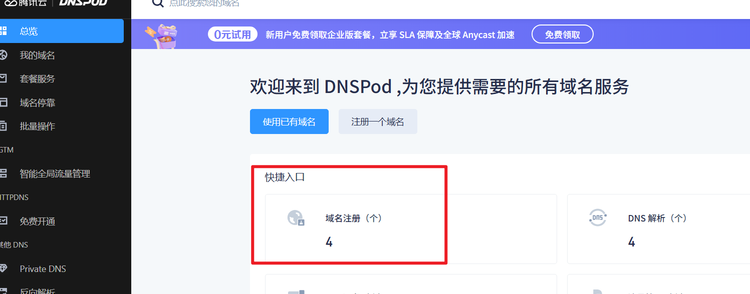 登录腾讯云控制台,搜索「域名解析 DNSPod」并进入。 https://console.dnspod.cn/ 点击直达