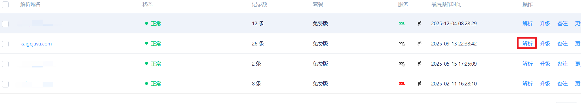 kaigejava.com),点击「解析」进入解析管理页。