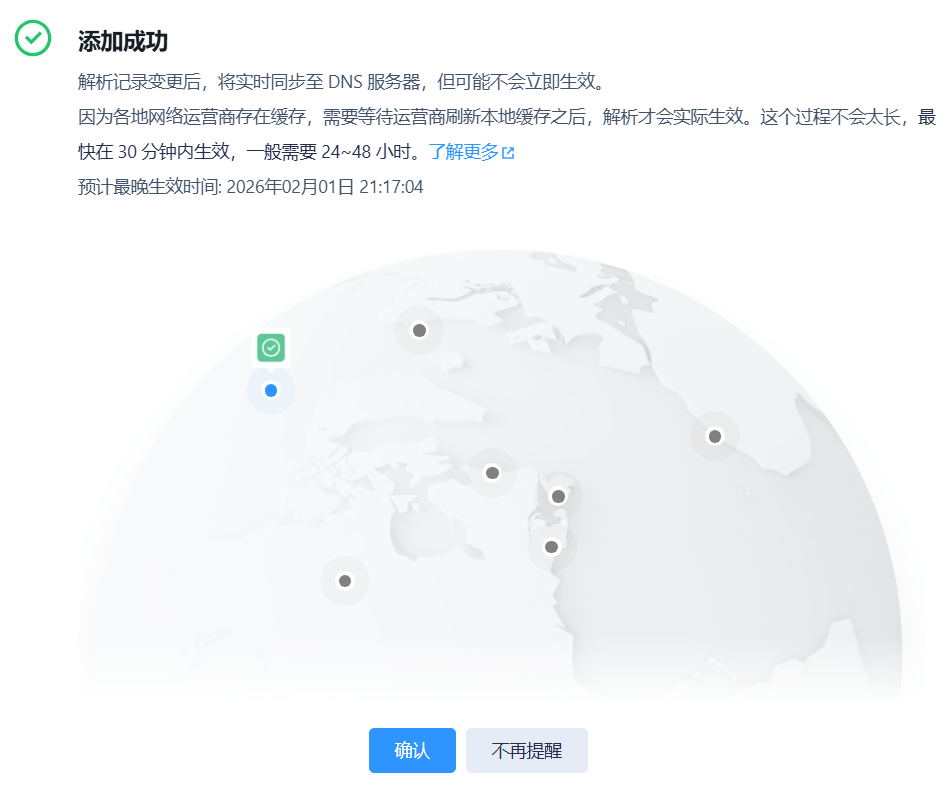 填写完成后点击「保存」,解析记录会在 TTL值对应的时间内生效(通常10分钟~1小时)。生效后,你的域名即可解析到阿里云的服务器IP。
