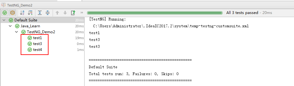 package com.java.learn;import org.testng.annotations.Test;/** * create by Anthony on 2017/10/31 */public class TestNG_Demo2 { @Test public void test1(){ System.out.println("test1"); } @Test(enabled=false) public void test2(){ System.out.println("test2"); } @Test public void test3(){ System.out.println("test3"); } @Test public void test4(){ System.out.println("test3"); }}
