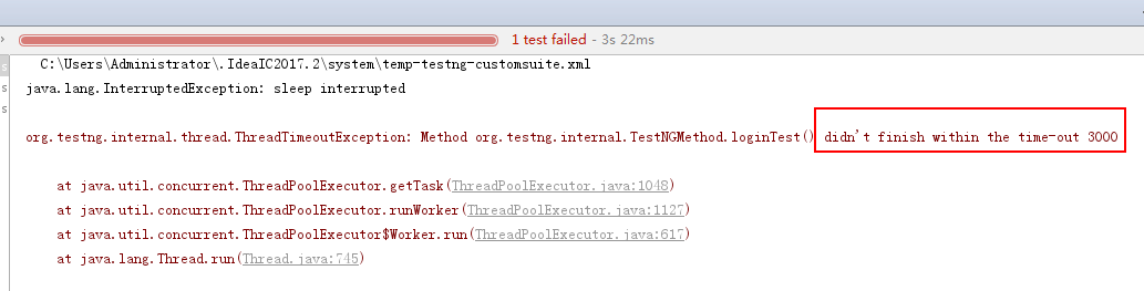 /** * create by Anthony on 2017/10/31 */public class TimeoutTest { @Test(timeOut = 3000) public void loginTest(){ try{ Thread.sleep(3100); }catch(InterruptedException e){ System.out.println(e.toString()); } }}